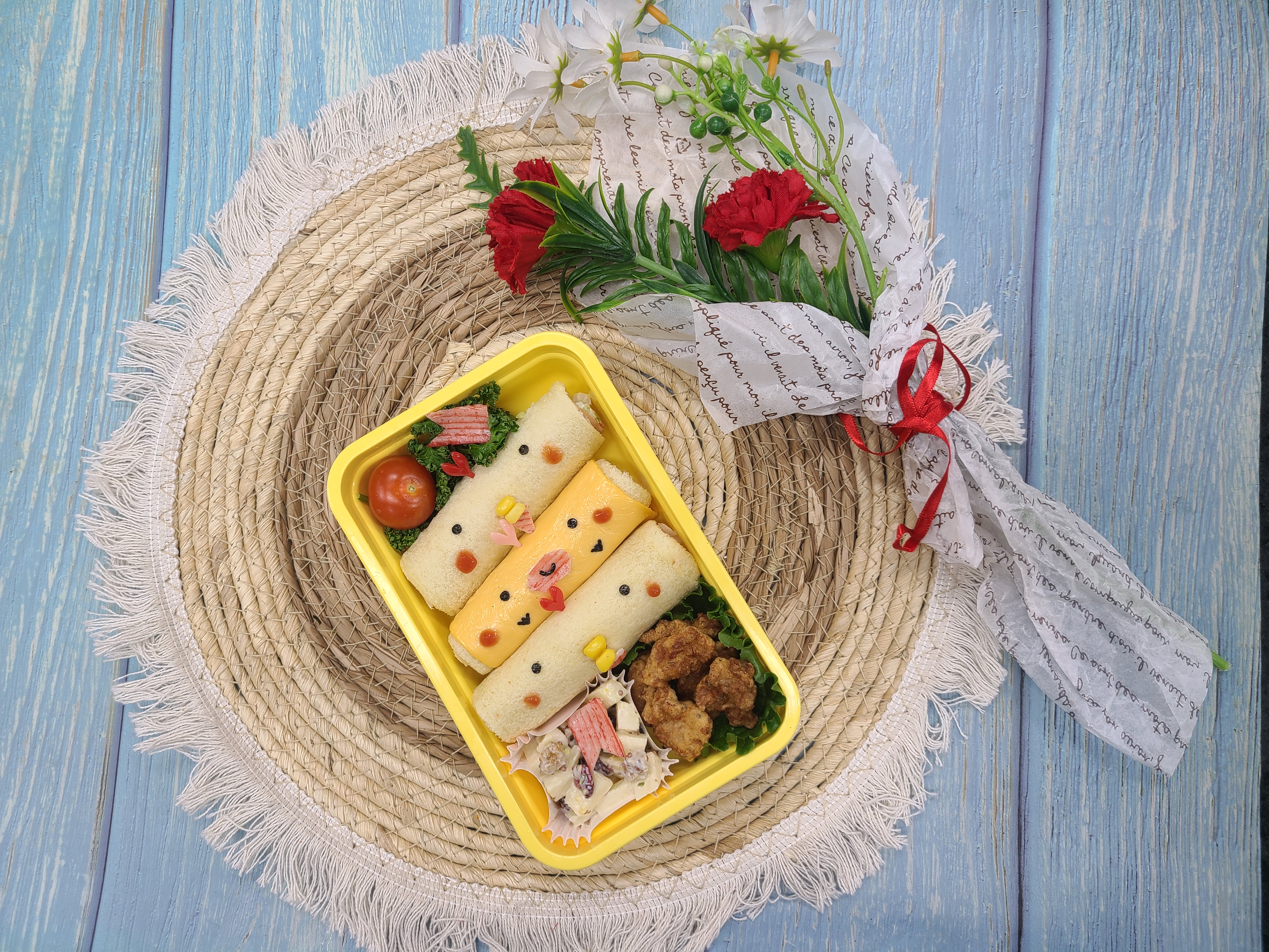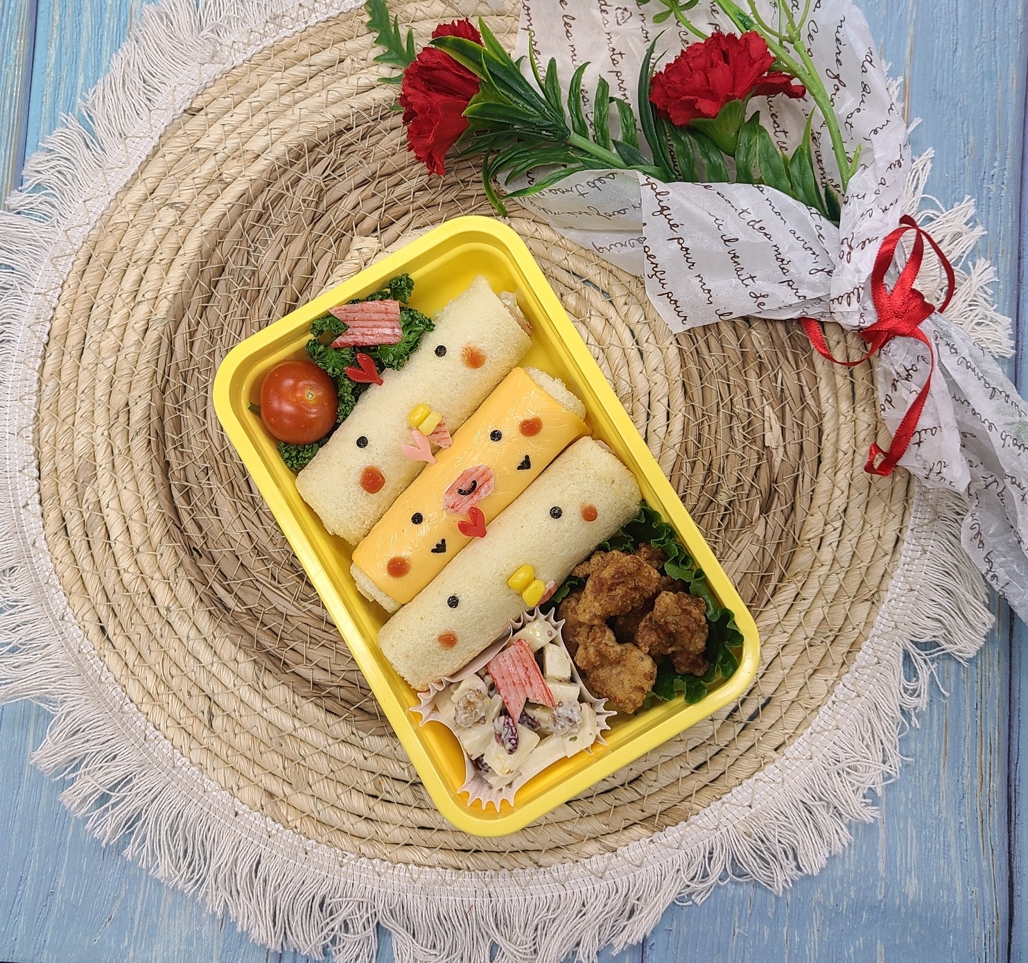 오늘은 보는 순간 미소가 절로 나오는 롤샌드위치 도시락을 소개해드릴게요. 귀여운 얼굴이 콕 박힌 샌드위치에, 바삭한 가라아게, 상큼한 월도프 샐러드까지! 보기에도 예쁘고 맛도 좋은 구성이어서 소풍이나 피크닉, 어린이집 간식, 혹은 특별한 날 준비하기 딱 좋아요.