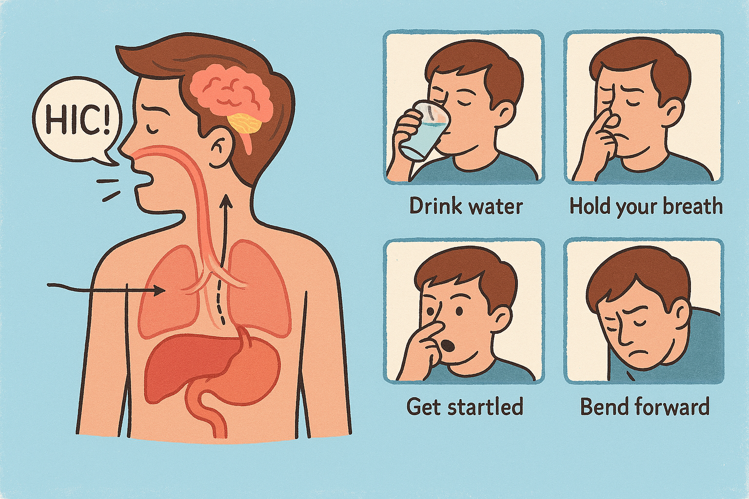 딸꾹질은 횡격막(diaphragm)이 비정상적으로 갑작스럽게 수축하는 현상입니다. 이 수축은 보통 미주신경(Vagus nerve)가슴신경(Phrenic nerve)을 통한 반사작용으로 일어납니다. 횡격막이 갑자기 수축하면 폐로 공기가 급격히 흡입되는데, 이때 성문(glottis)이 즉시 닫히면서 특유의 ‘딸꾹’ 소리가 발생합니다.