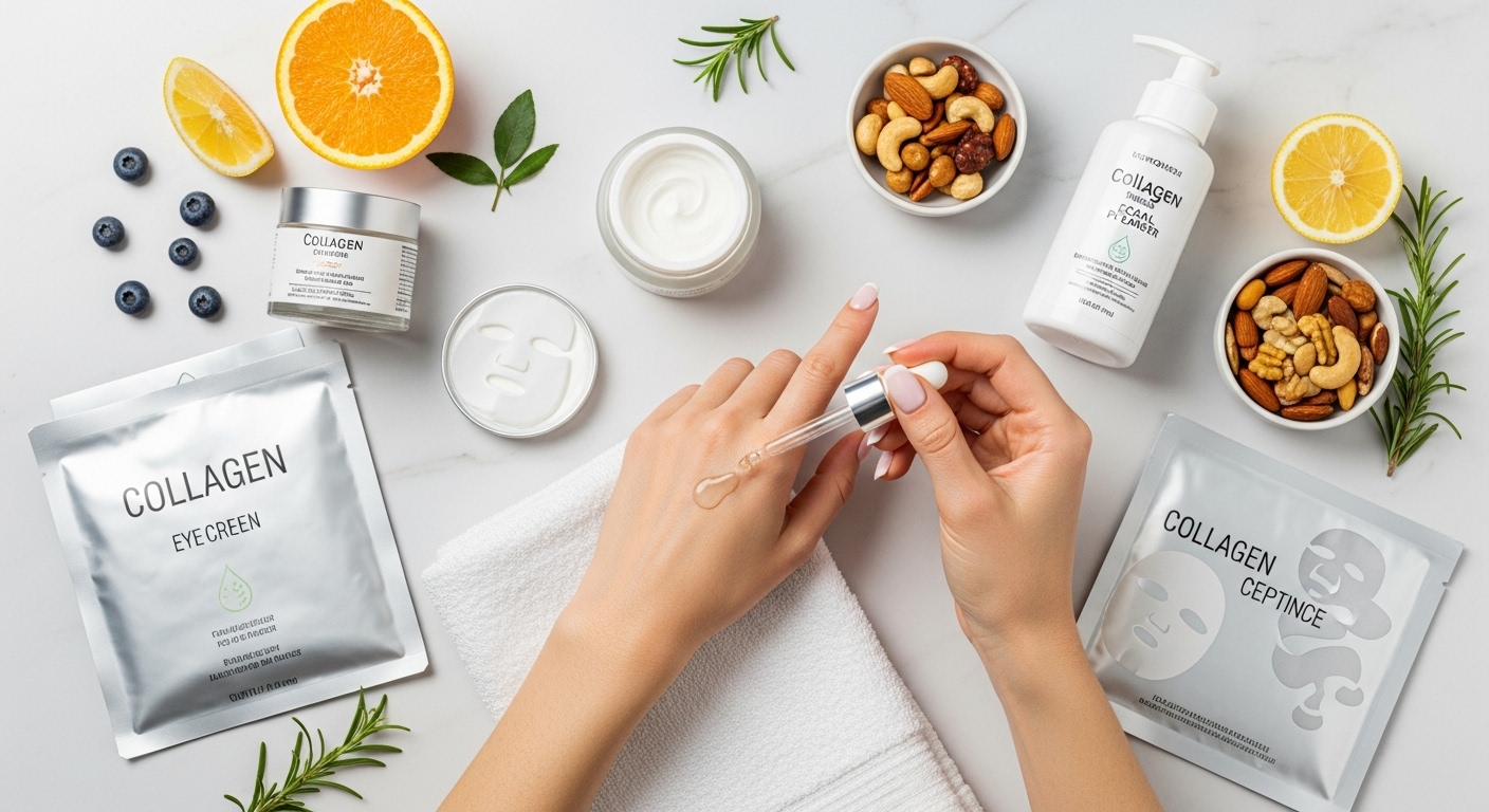 세안 후 1분 내에 토너·에센스·크림을 차례로 발라 수분막을 형성하세요. - 콜라겐 부스터 제품 사용
