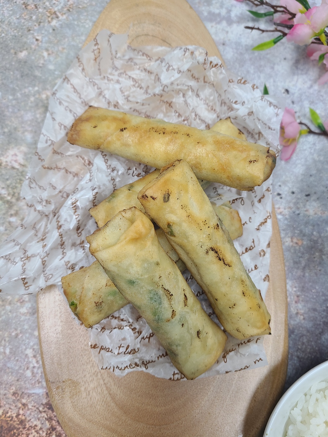 - 팬에 기름을 넉넉히 두르고 춘권을 노릇하게 구워낸다.