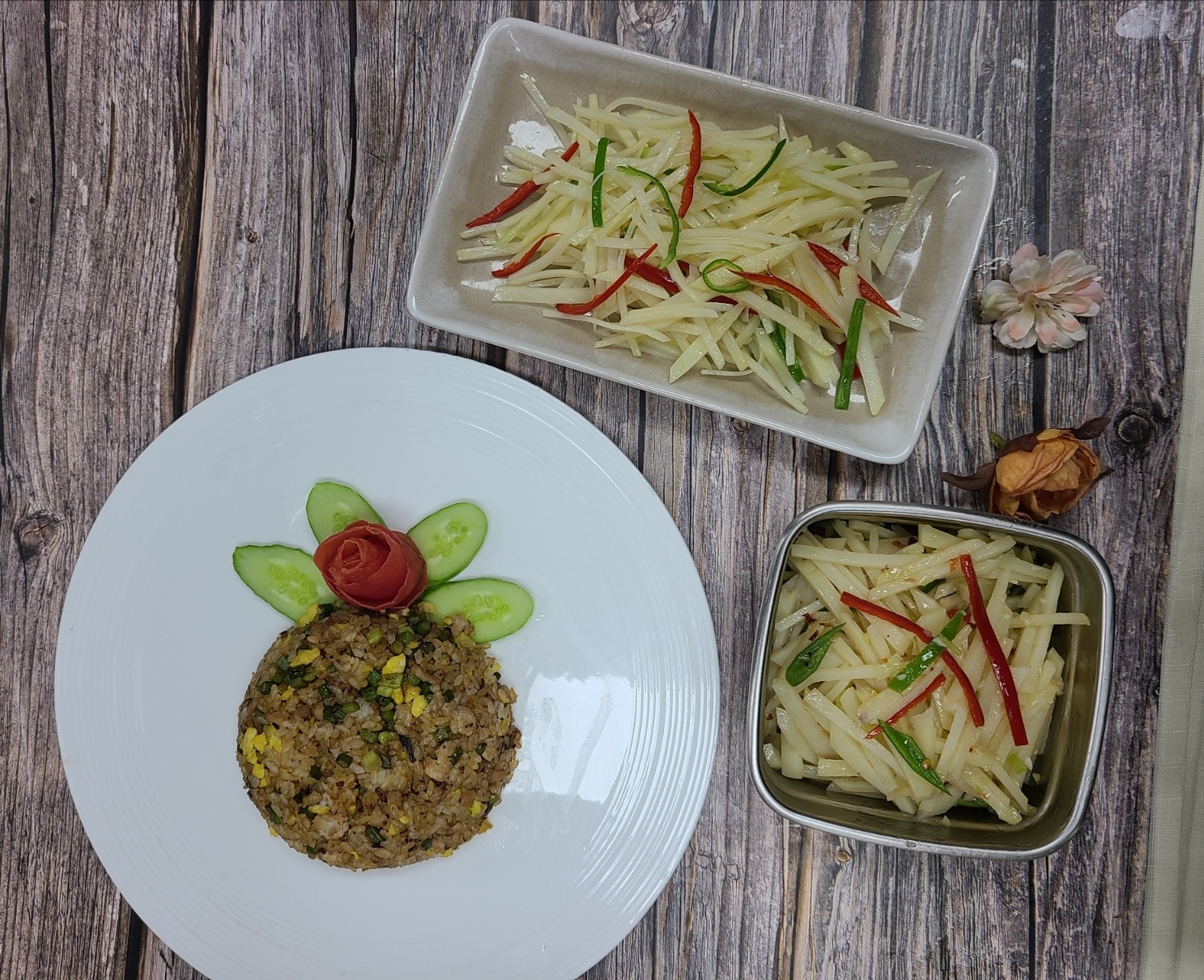 - 비빔밥 토핑: 감자채 무침을 밥 위에 올리고 고추장 넣어 비벼 먹기.